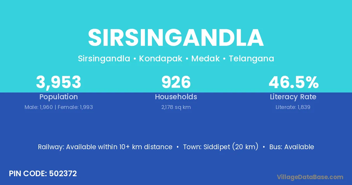 Sirsingandla village has a total population of 3,953 people, of which 1,960 are males and 1,993 are females.