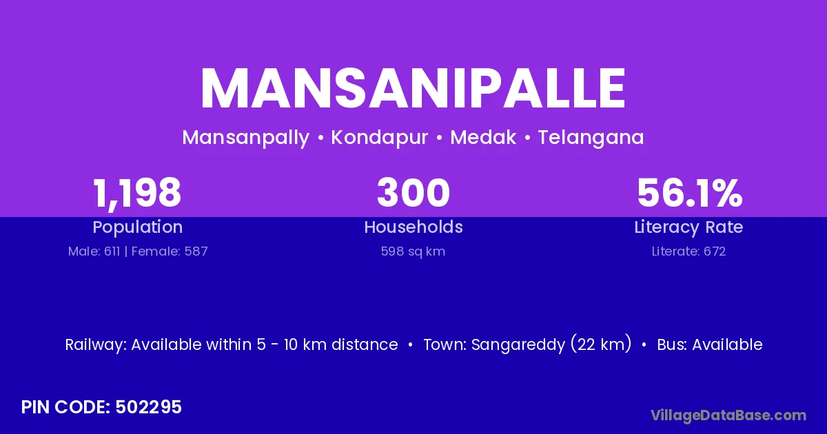 Sangareddy (22 km) is the nearest town to Mansanipalle village for major economic activities and is located approximately 22 km away.