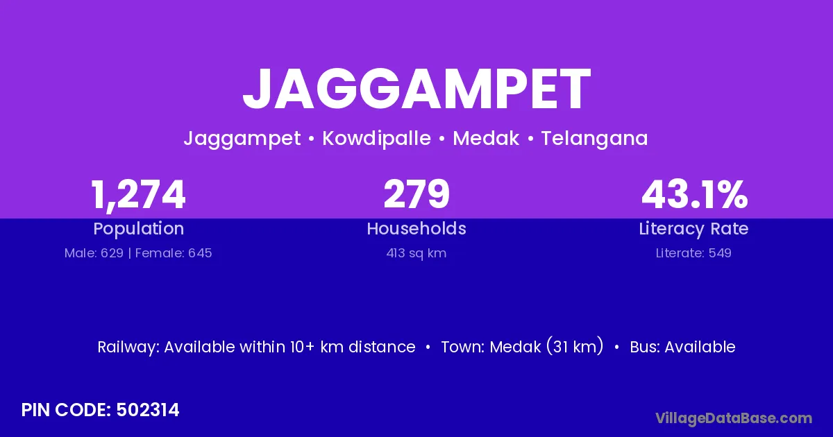 Medak (31 km) is the nearest town to Jaggampet village for major economic activities and is located approximately 31 km away.