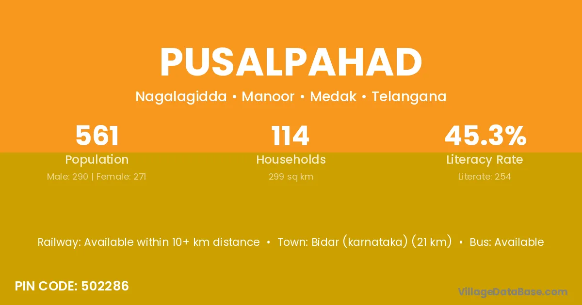Pusalpahad village has a total population of 561 people, of which 290 are males and 271 are females.