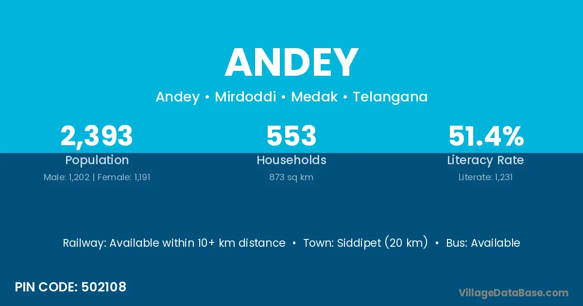 Siddipet (20 km) is the nearest town to Andey village for major economic activities and is located approximately 20 km away.