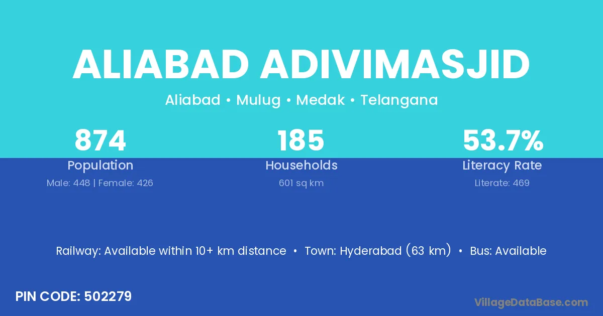 Hyderabad (63 km) is the nearest town to Aliabad Adivimasjid village for major economic activities and is located approximately 63 km away.