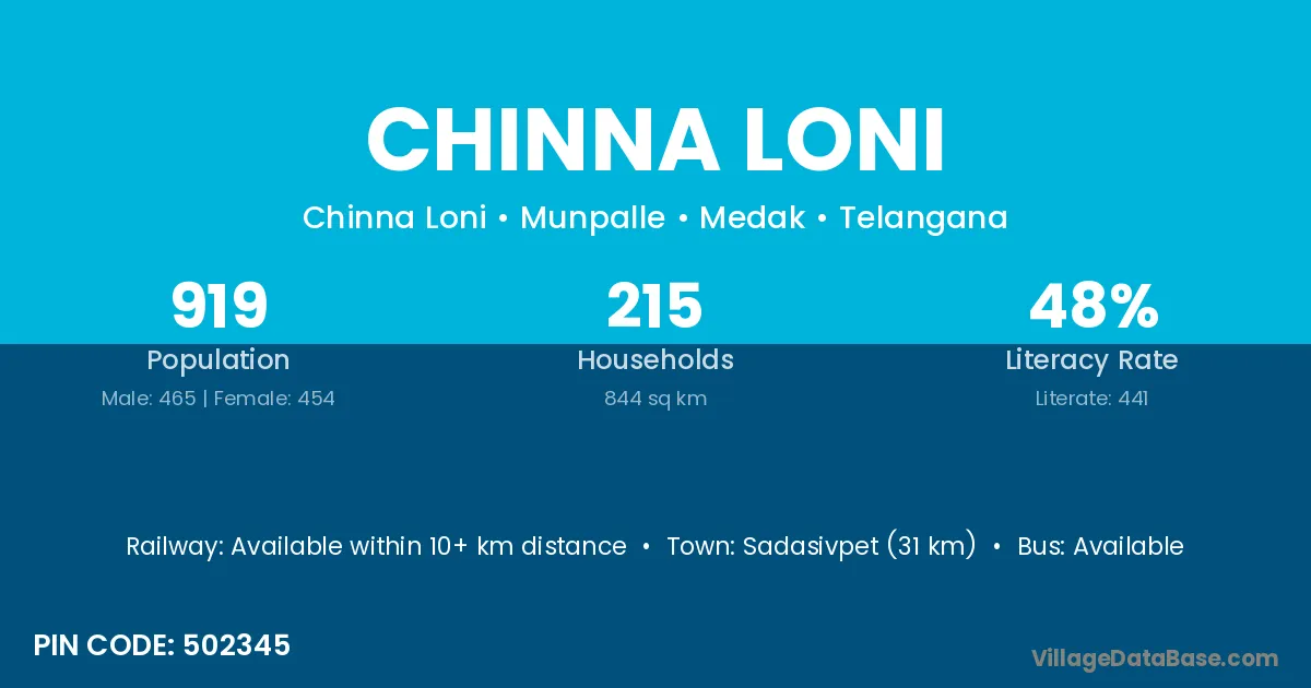 Sadasivpet (31 km) is the nearest town to Chinna Loni village for major economic activities and is located approximately 31 km away.