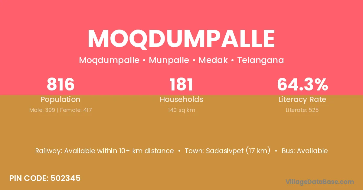 Sadasivpet (17 km) is the nearest town to Moqdumpalle village for major economic activities and is located approximately 17 km away.
