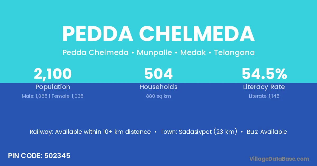 Sadasivpet (23 km) is the nearest town to Pedda Chelmeda village for major economic activities and is located approximately 23 km away.