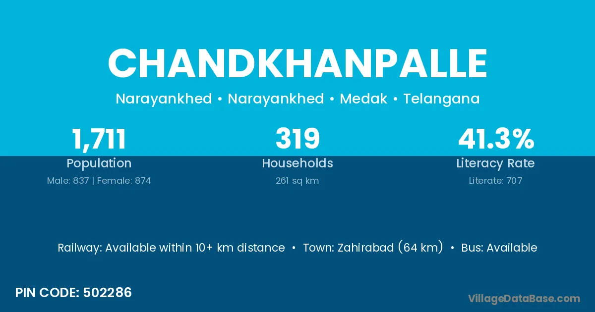 Zahirabad (64 km) is the nearest town to Chandkhanpalle village for major economic activities and is located approximately 64 km away.