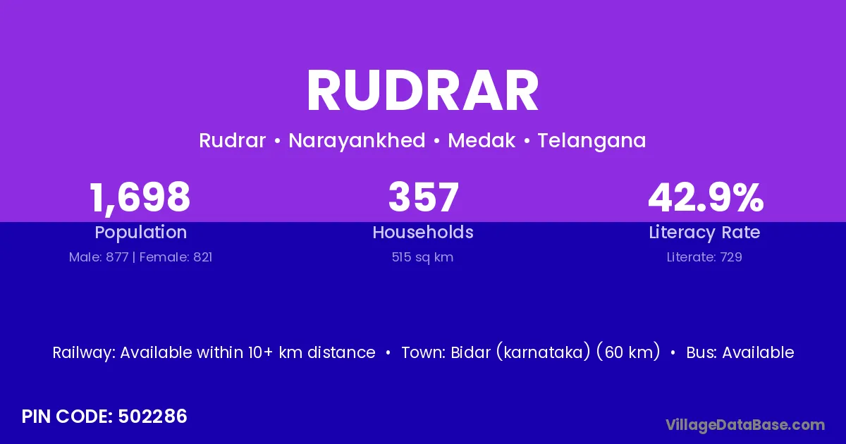 Bidar (karnataka) (60 km) is the nearest town to Rudrar village for major economic activities and is located approximately 60 km away.