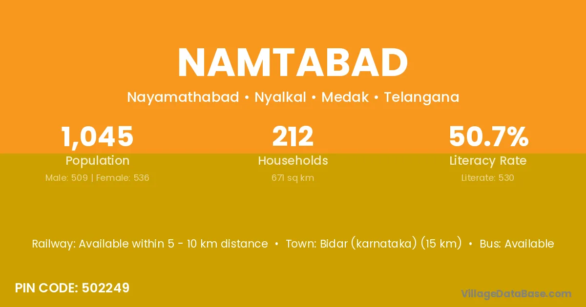Bidar (karnataka) (15 km) is the nearest town to Namtabad village for major economic activities and is located approximately 15 km away.
