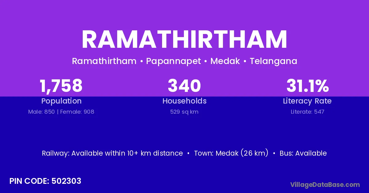 Medak (26 km) is the nearest town to Ramathirtham village for major economic activities and is located approximately 26 km away.