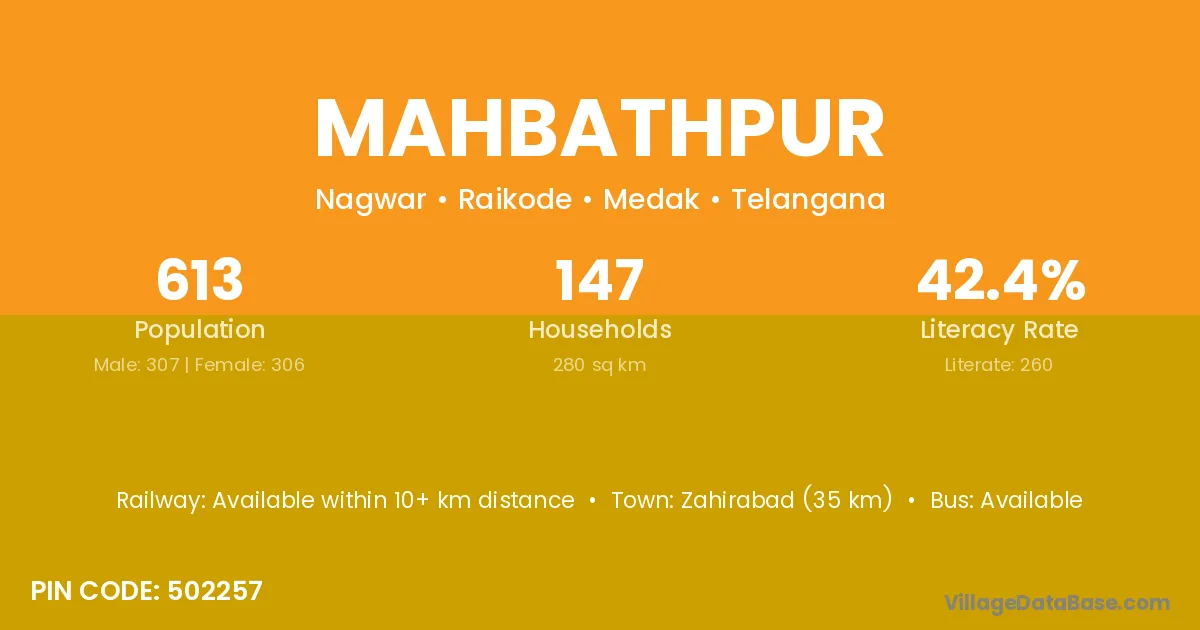 Zahirabad (35 km) is the nearest town to Mahbathpur village for major economic activities and is located approximately 35 km away.
