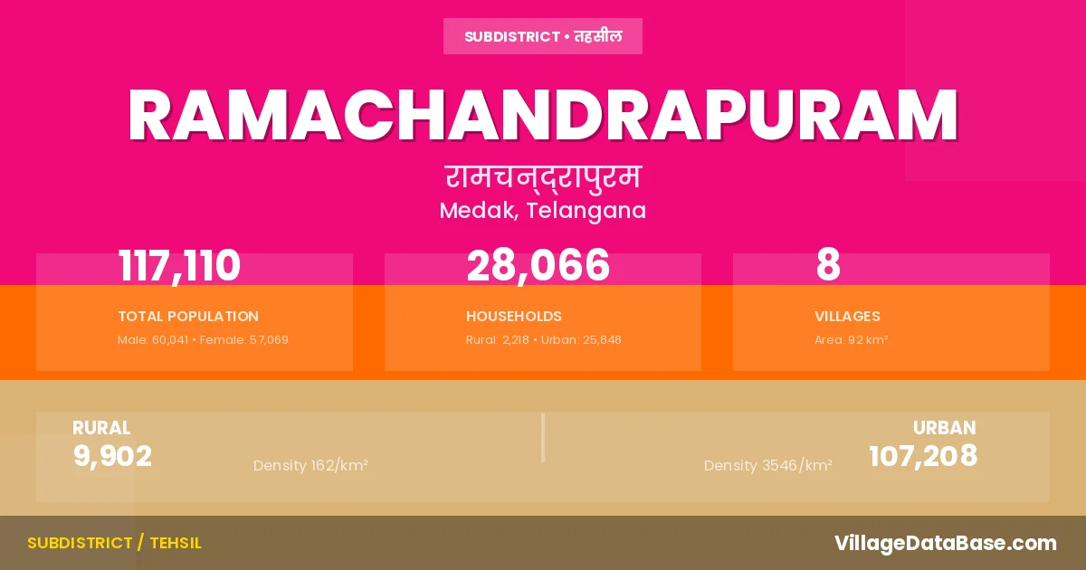 Ramachandrapuram is a town and Mandal in the Medak district of the Telangana. In India, a Mandal is a subdivision of a district responsible for the administration and revenue collection of a specific area within the district. Mandals play a crucial role in the local governance structure, contributing significantly to the development and administration of their communities.