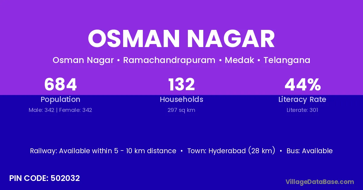 Hyderabad (28 km) is the nearest town to Osman Nagar village for major economic activities and is located approximately 28 km away.