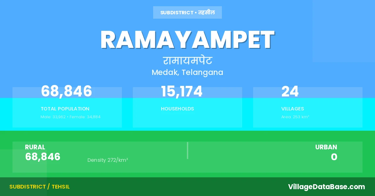 According to the 2011 census The total area of Ramayampet Mandal is 253 km², with a population of 68846 people. The population density is 272 inhabitants per square kilometre, and there are approximately 15174 houses in the sub district.