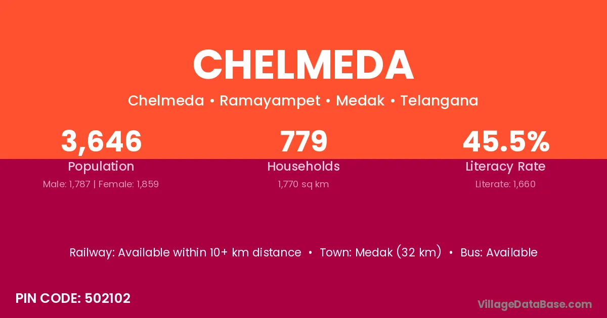 Medak (32 km) is the nearest town to Chelmeda village for major economic activities and is located approximately 32 km away.