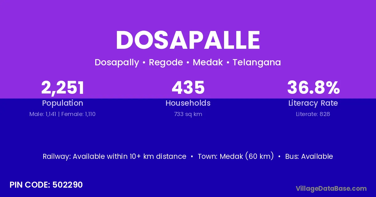 Medak (60 km) is the nearest town to Dosapalle village for major economic activities and is located approximately 60 km away.