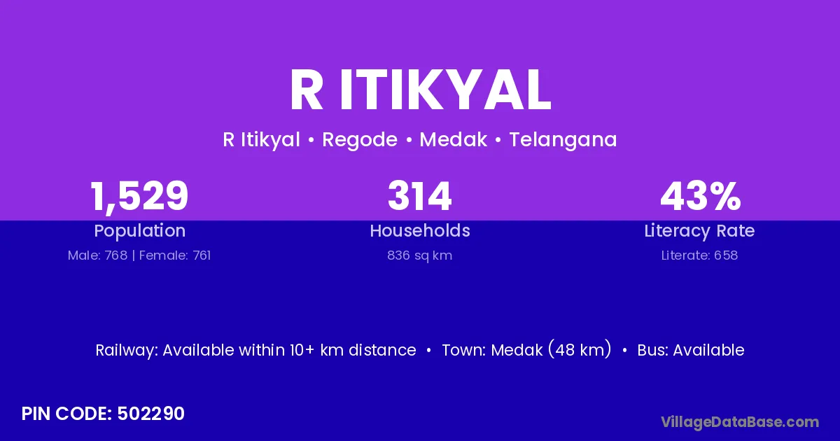 R Itikyal village is located in the Regode Mandal of the Medak district in Telangana .