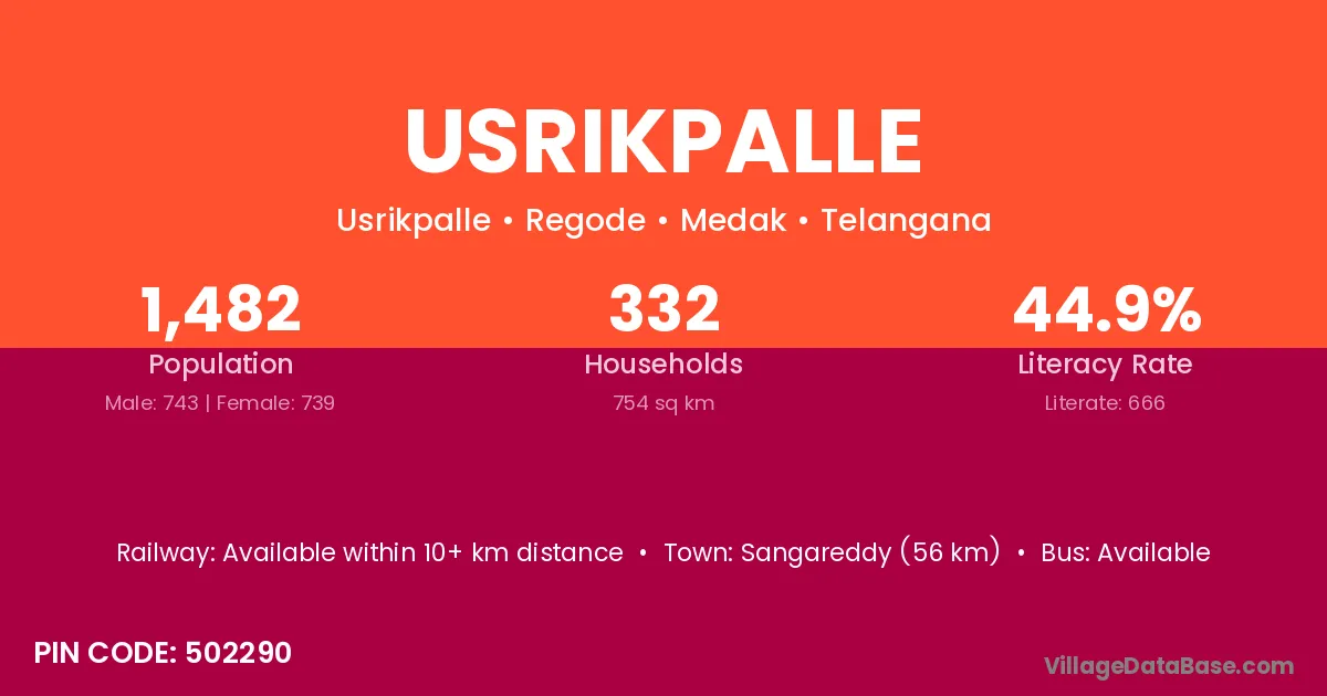 Sangareddy (56 km) is the nearest town to Usrikpalle village for major economic activities and is located approximately 56 km away.
