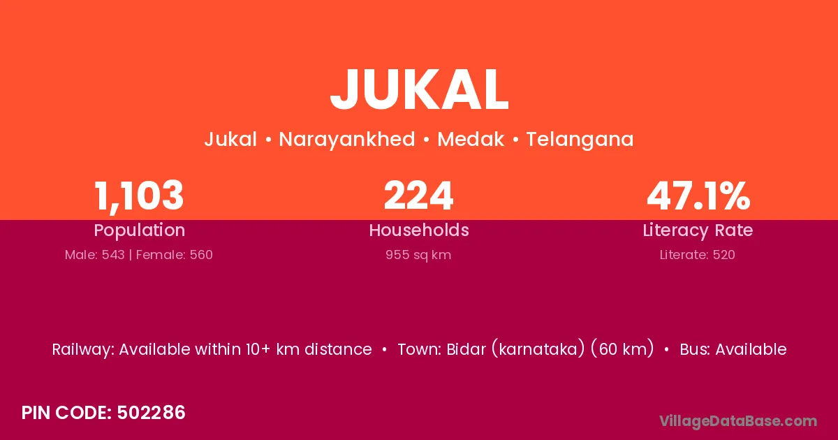 Medak (52 km) is the nearest town to Jukal village for major economic activities and is located approximately 52 km away.