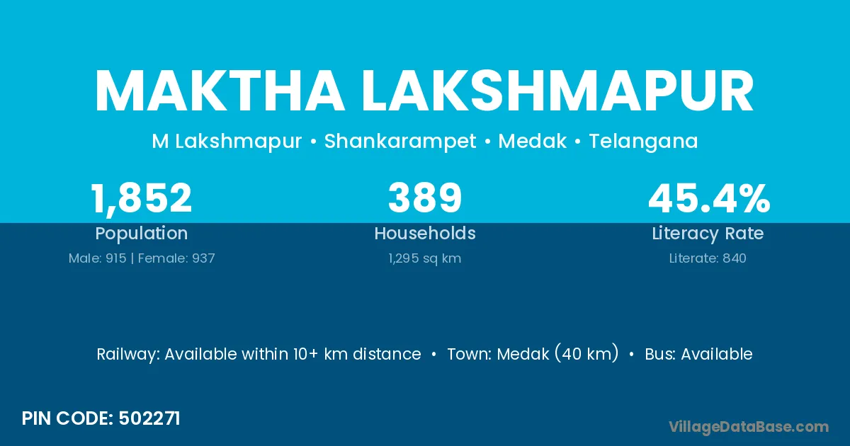 Medak (40 km) is the nearest town to Maktha Lakshmapur village for major economic activities and is located approximately 40 km away.