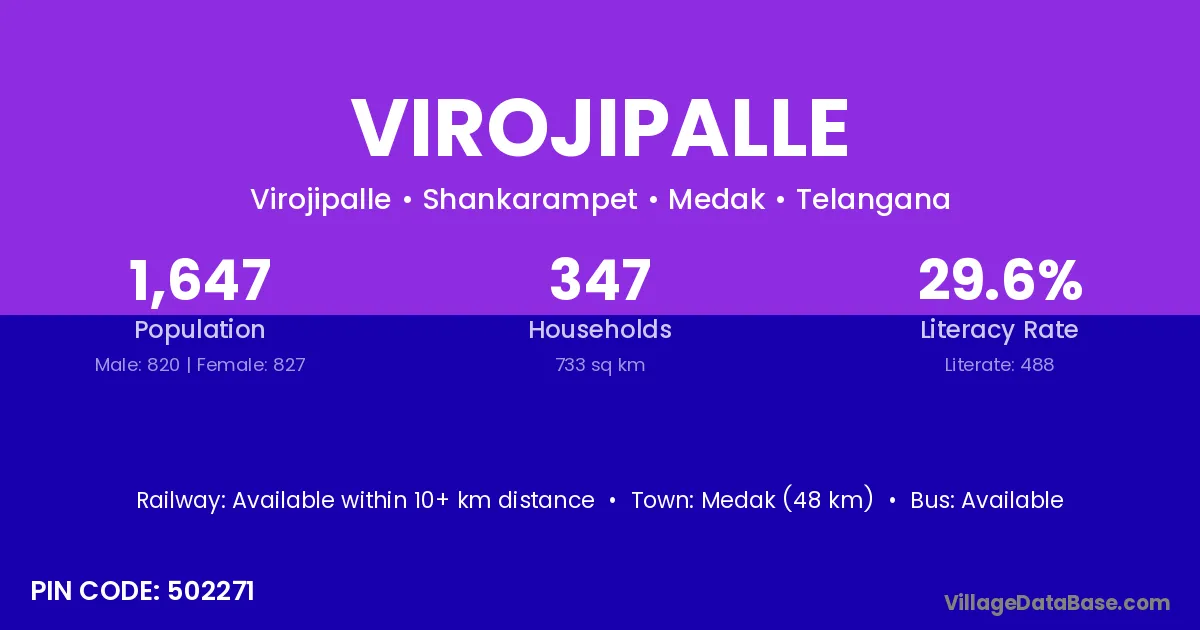 Medak (48 km) is the nearest town to Virojipalle village for major economic activities and is located approximately 48 km away.