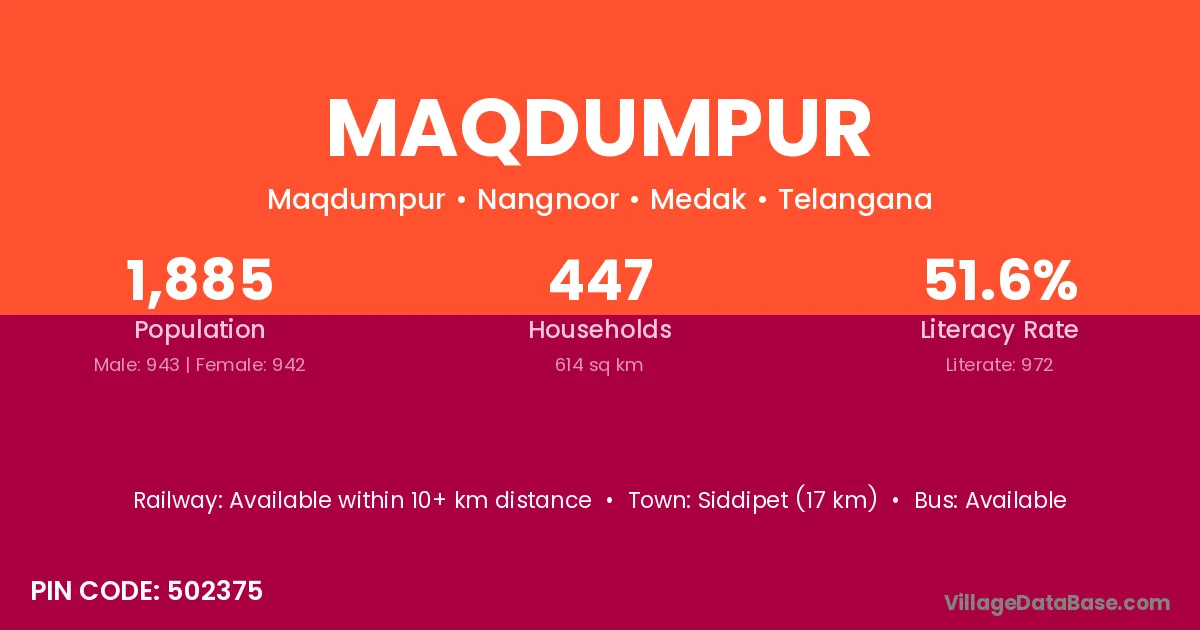 Sangareddy (42 km) is the nearest town to Maqdumpur village for major economic activities and is located approximately 42 km away.