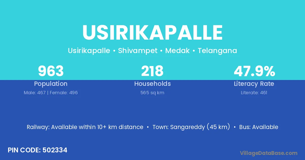 Sangareddy (45 km) is the nearest town to Usirikapalle village for major economic activities and is located approximately 45 km away.