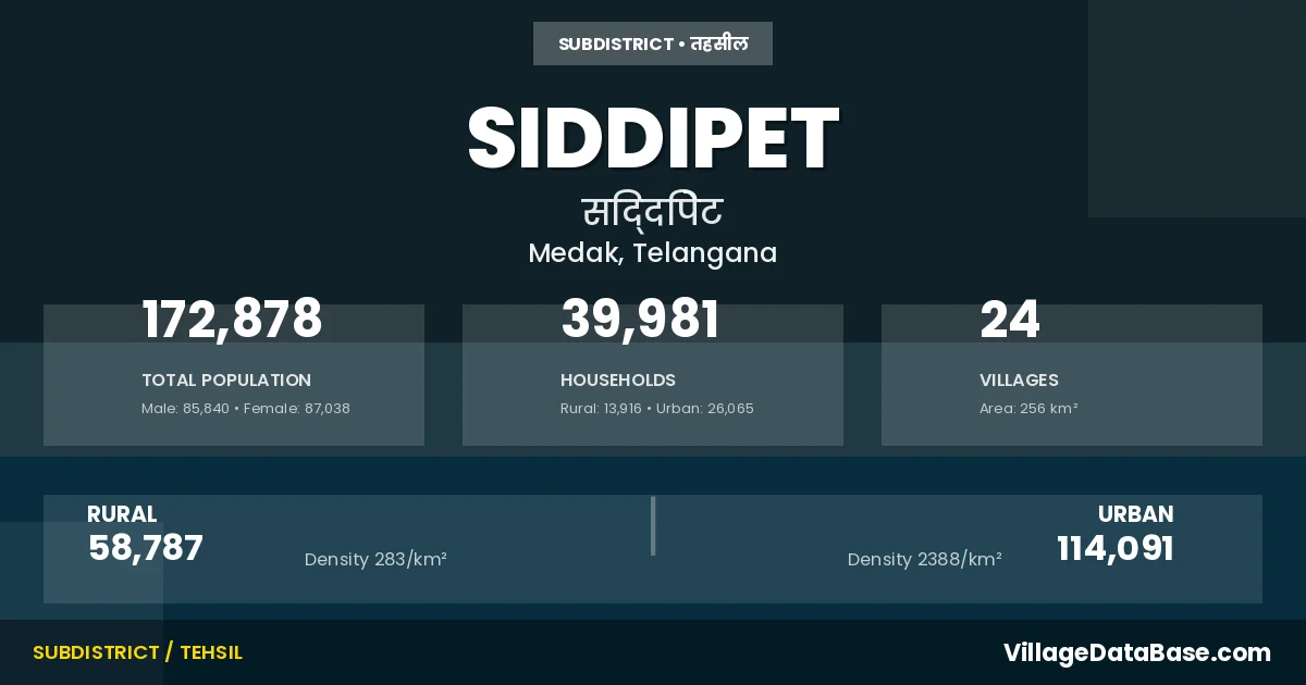 According to the 2011 census The total area of Siddipet Mandal is 256 km², with a population of 172878 people. The population density is 676 inhabitants per square kilometre, and there are approximately 39981 houses in the sub district.