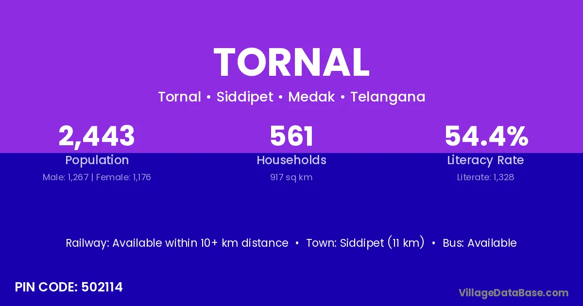 Siddipet (11 km) is the nearest town to Tornal village for major economic activities and is located approximately 11 km away.