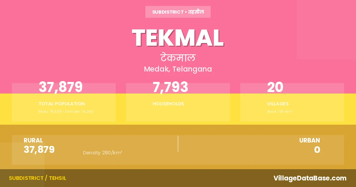 According to the 2011 census The total area of Tekmal Mandal is 136 km², with a population of 37879 people. The population density is 280 inhabitants per square kilometre, and there are approximately 7793 houses in the sub district.