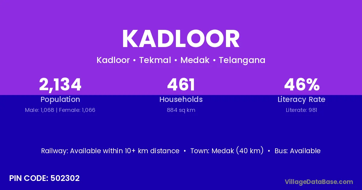 Medak (40 km) is the nearest town to Kadloor village for major economic activities and is located approximately 40 km away.