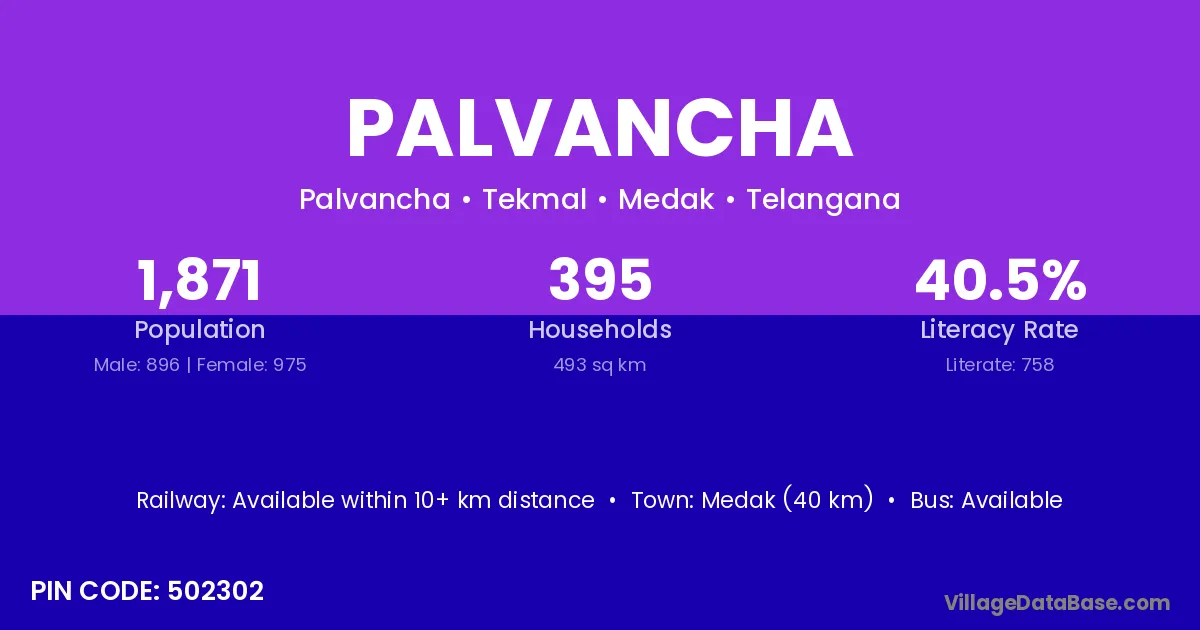 Medak (40 km) is the nearest town to Palvancha village for major economic activities and is located approximately 40 km away.