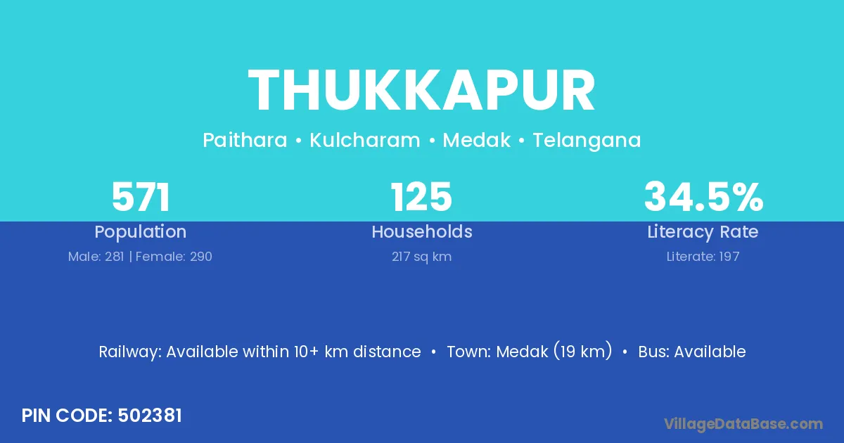Siddipet (16 km) is the nearest town to Thukkapur village for major economic activities and is located approximately 16 km away.