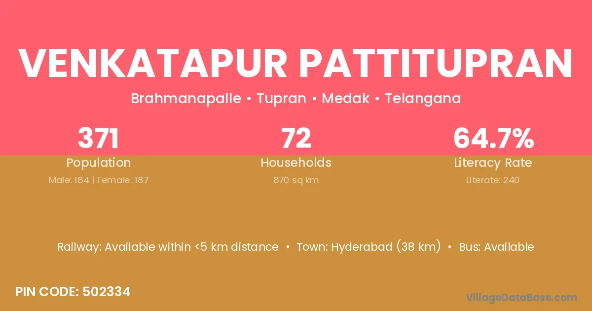 Hyderabad (38 km) is the nearest town to Venkatapur Pattitupran village for major economic activities and is located approximately 38 km away.