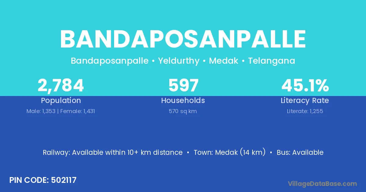 Medak (14 km) is the nearest town to Bandaposanpalle village for major economic activities and is located approximately 14 km away.