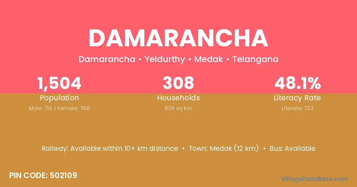 Medak (12 km) is the nearest town to Damarancha village for major economic activities and is located approximately 12 km away.