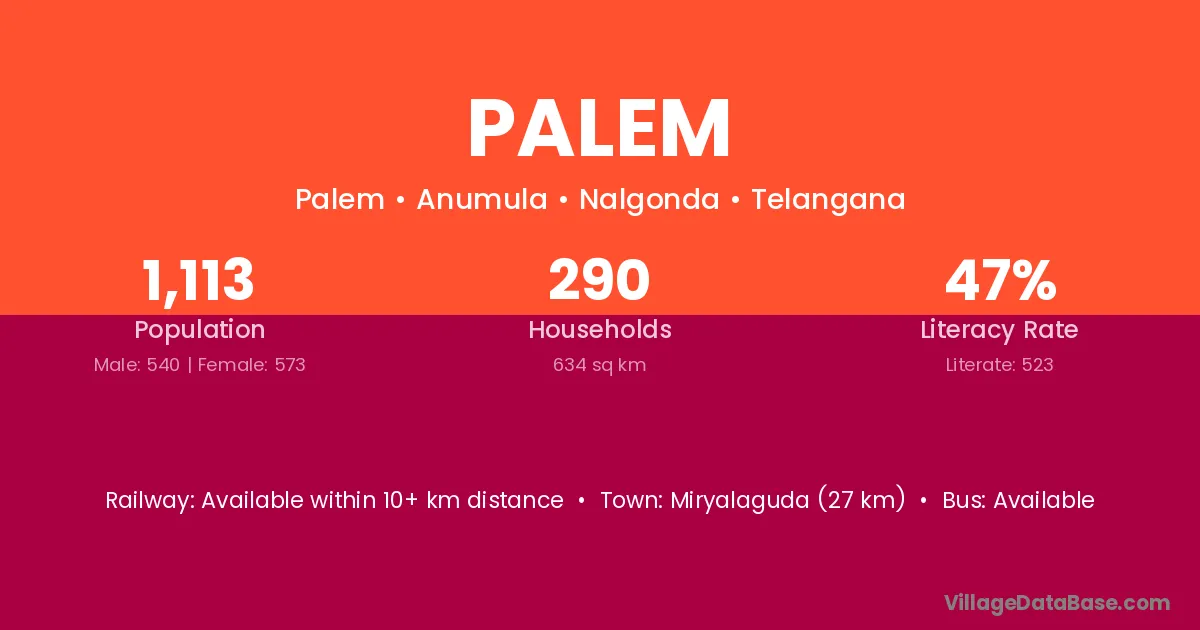 Miryalaguda (27 km) is the nearest town to Palem village for major economic activities and is located approximately 27 km away.