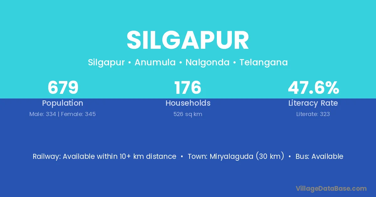 Miryalaguda (30 km) is the nearest town to Silgapur village for major economic activities and is located approximately 30 km away.