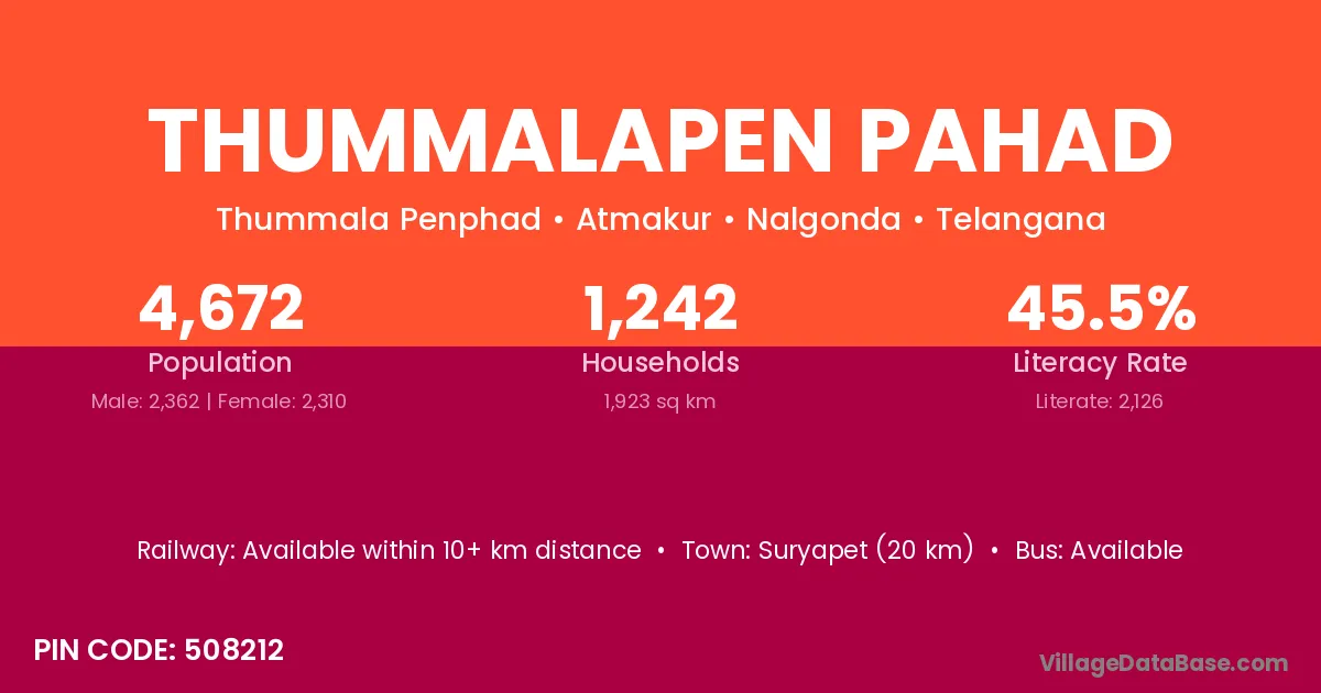 Suryapet (20 km) is the nearest town to Thummalapen Pahad village for major economic activities and is located approximately 20 km away.