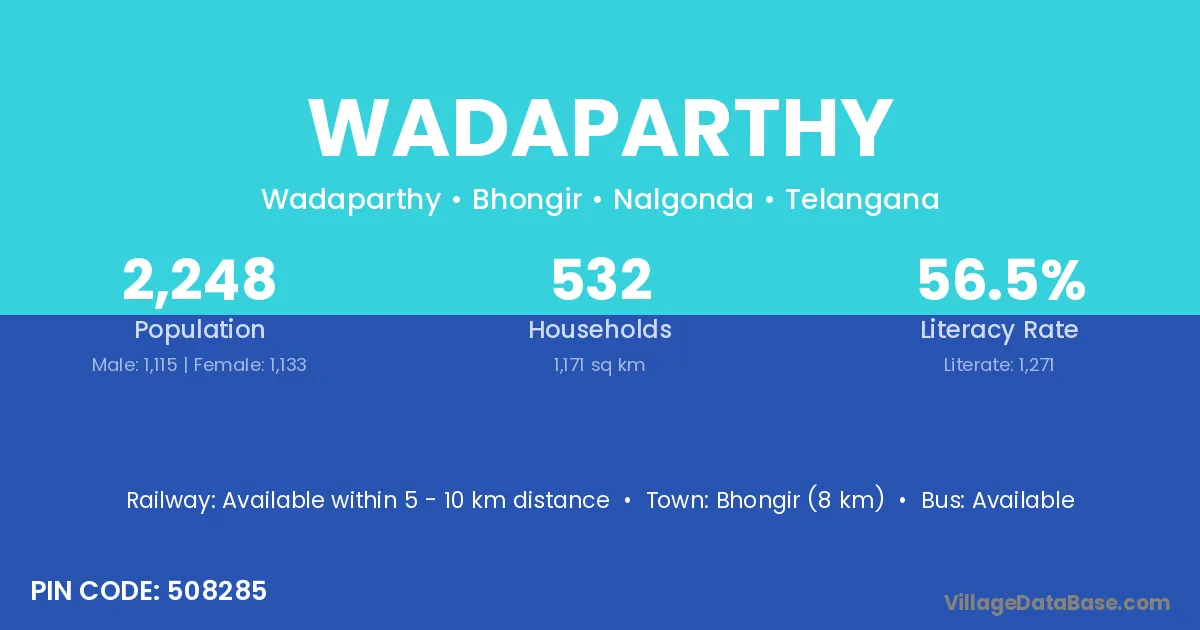 Bhongir (8 km) is the nearest town to Wadaparthy village for major economic activities and is located approximately 8 km away.