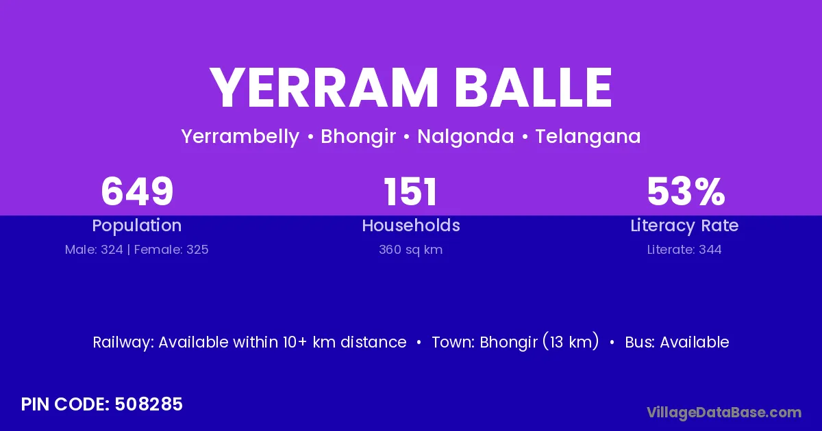 Bhongir (13 km) is the nearest town to Yerram Balle village for major economic activities and is located approximately 13 km away.