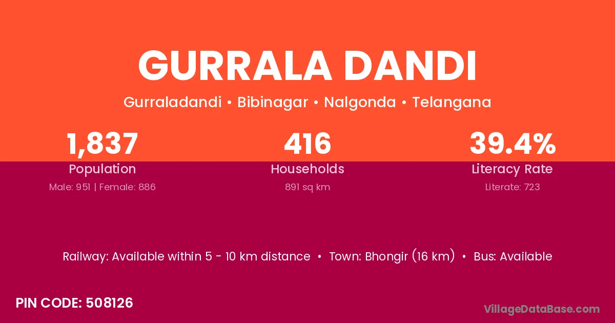Bhongir (16 km) is the nearest town to Gurrala Dandi village for major economic activities and is located approximately 16 km away.