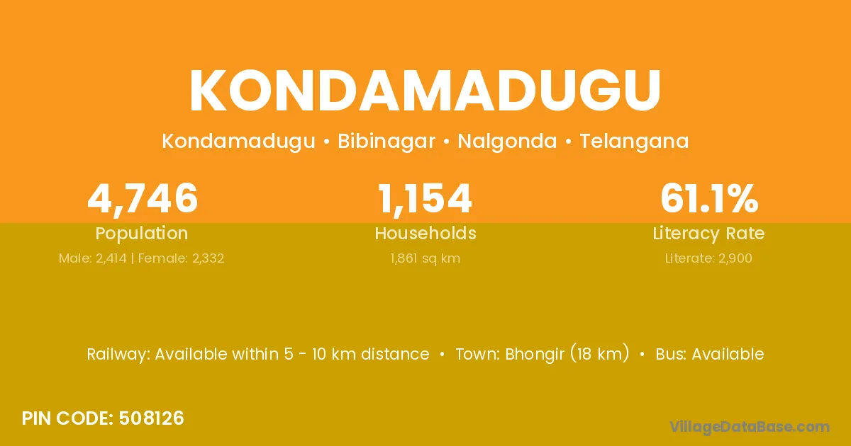 Bhongir (18 km) is the nearest town to Kondamadugu village for major economic activities and is located approximately 18 km away.