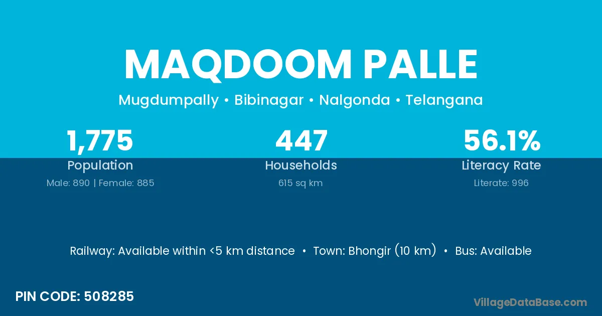 Bhongir (10 km) is the nearest town to Maqdoom Palle village for major economic activities and is located approximately 10 km away.