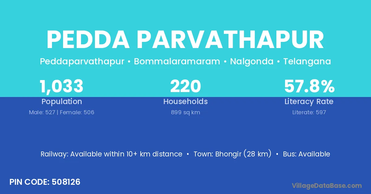 Pedda Parvathapur village has a total population of 1,033 people, of which 527 are males and 506 are females.