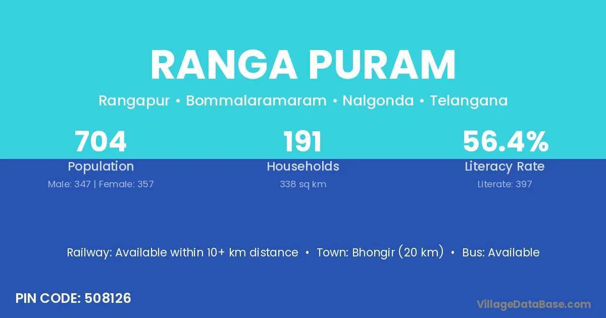 Bhongir (20 km) is the nearest town to Ranga Puram village for major economic activities and is located approximately 20 km away.