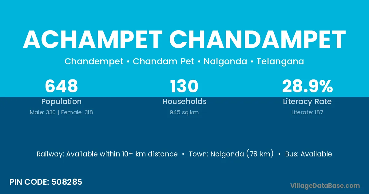 The literacy rate of Achampet Chandampet village is 28.86%. Male literacy stands at 43.94% and female literacy at 13.21%.