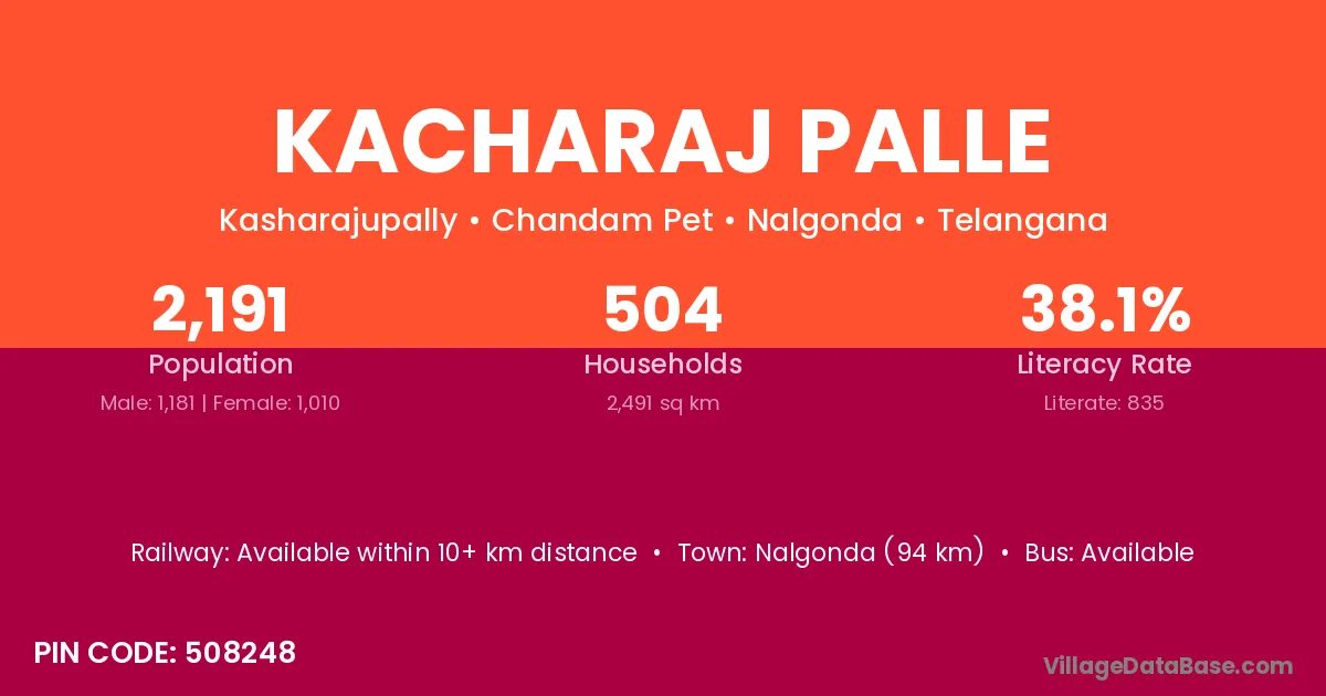 Nalgonda (94 km) is the nearest town to Kacharaj Palle village for major economic activities and is located approximately 94 km away.