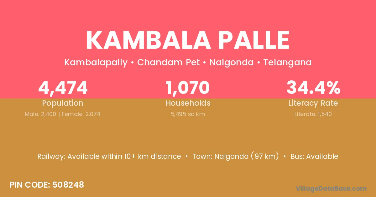 Nalgonda (97 km) is the nearest town to Kambala Palle village for major economic activities and is located approximately 97 km away.