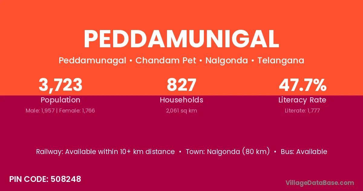 Nalgonda (80 km) is the nearest town to Peddamunigal village for major economic activities and is located approximately 80 km away.