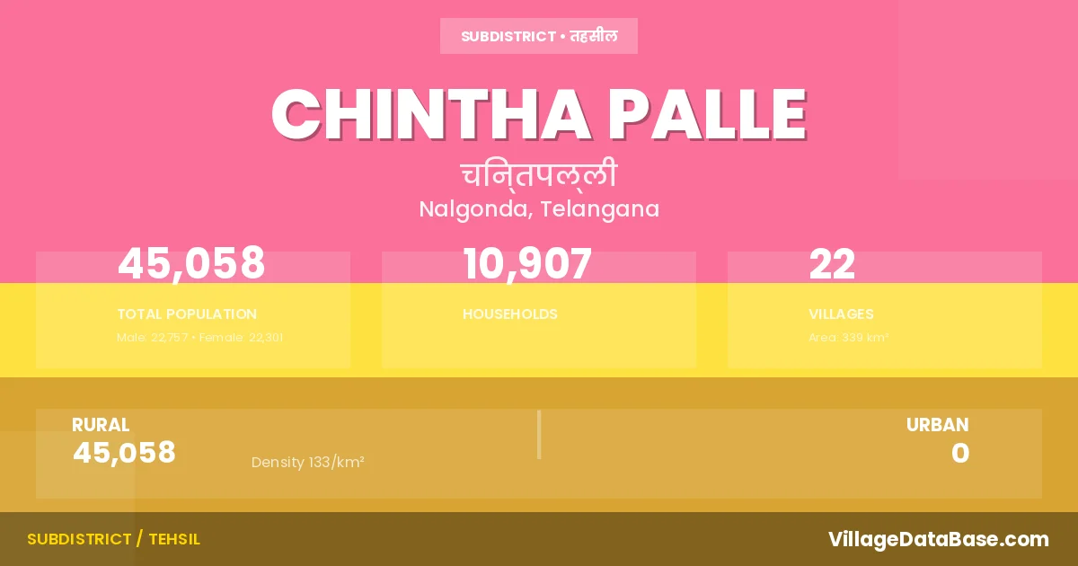 According to the 2011 census The total area of Chintha Palle Mandal is 339 km², with a population of 45058 people. The population density is 133 inhabitants per square kilometre, and there are approximately 10907 houses in the sub district.